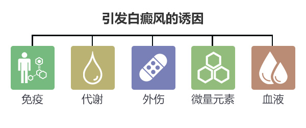 冻伤、烧伤、手术等外伤因素都可能引发白癜风的产生。外伤因素不仅能使局部皮肤变白,也可能引起远离部位的白斑,其发生机理就是黑素细胞的损伤,从而诱发免疫功能紊乱所致。手术病人也常会在皮肤切口部位出现白斑。专家表示由于机体应激性改变,亦可因神经化学因素或免疫失调而导致散发型、泛发型白癜风病。